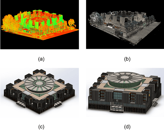 Hình 2. Dữ liệu và mô hình 3D Tòa nhà Quốc hội. (a) Dữ liệu đám mây điểm. (b) Dữ liệu hình ảnh. (c) và (d) Mô hình 3D xây dựng từ dữ liệu thu được